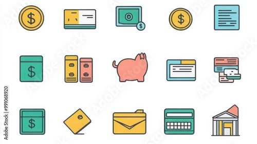 Finance thin line icon set. Containing wallet, piggy bank, ATM, dollar sign, credit card, bar chart, coin stack, money