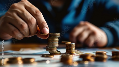 Financial Analysis Visualized: Man Organizes Coins into Stacks for Budgeting and Investments