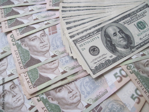 Financial background with a lot of paper banknotes of Ukrainian 500 hryvnia and 100 dollars is great for editorial publication about money exchange.