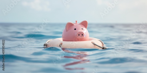 Financial Buoyancy: A pink piggy bank confidently navigates calm blue waters on a life preserver, symbolizing financial security and preparedness.
