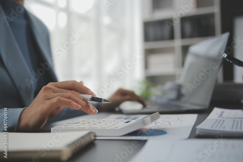 Financial Business team present. Business man hands hold documents with financial statistic stock photo, discussion, and analysis report data the charts and graphs. Finance Financial concept