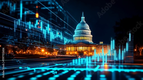 financial data government building. A nighttime view of the U.S. Capitol building, overlaid with digital graphics representing data and technology.