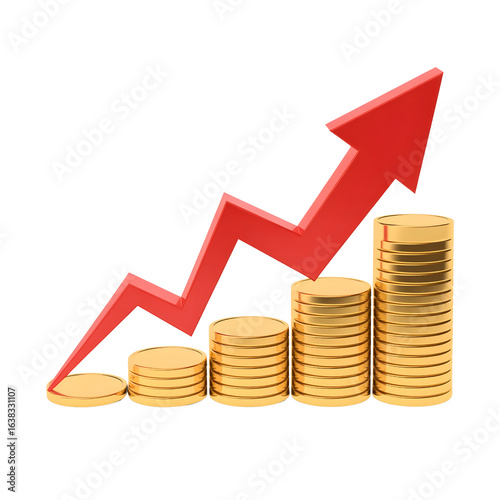 Financial Growth Chart with Increasing Coin Stacks and Red Upward Arrow on Black Background Representing Investment Success and Economic Prosperity