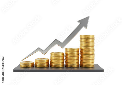 Financial growth represented by stacks of gold coins and an upward trending arrow, isolated on transparent background