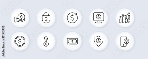 Financial management set icon. Money transfer, transaction, dollar bill, letter, cash advance, atm, cashless payment, hand, envelope, accounting report, budget. Neomorphism style. Vector line icon