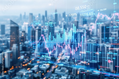 Financial stock chart with data overlays and bar graphs on a blurred cityscape background, depicting futuristic finance and economic growth concept. Ai generative