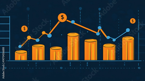 business, finance, graph, datum, trend, bar, chart, analysis, investment, money, dollar, revenue, growth, decayed, economy, report, presentation, financial, vector, orange, blue, dark, background, illustration, graphic, design, digital, modern, abstract, profitability, performance, column, isolated, statistic, number