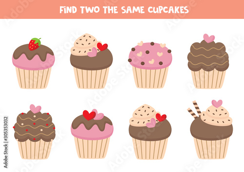 vector, children, education, educational, printable, preschool, school, material, children, learning, game, fun, funny, cute, page, toddler, illustration, activity, object, play, lesson, find, cake, cupcake, same, strawberry, muffin, nubes, chocolate, pink, food, pastry