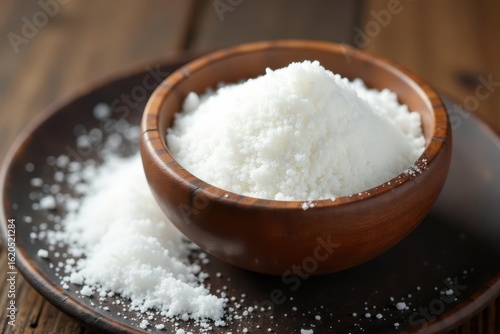 Fine granulated white sugar fills a rustic wooden bowl , confectionery, granulated sugar, food photography