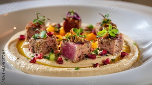 mediterranean, hummus, dish, epicure, swirl, elegant, fresh, healthy, clean, plated, flavorful, cookery, vegetarian, herb, minimal, stylish, food, artistic, modern, creamy, chickpea