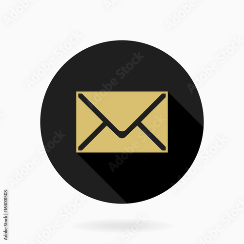 Fine vector golden mail icon in the black circle. Flat design and long shadow