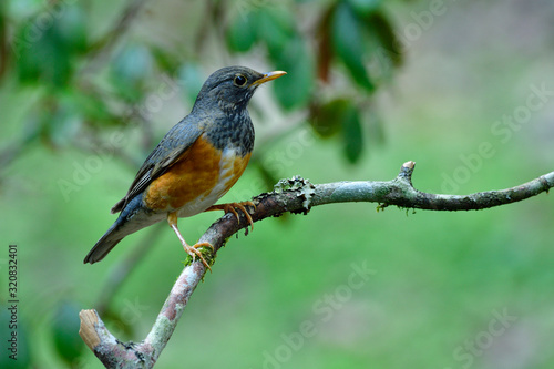 Finel brown belly with grey wings to neck and face perching on wooden branch in soft lighting in forest, Female of Black-breasted thrush (Turdus dissimilis)