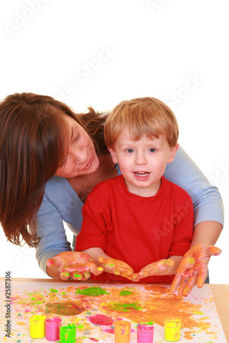 paint, painting, fun, creativity, children, childhood, boy, son, mother, family, together, human, thumb, human finger, finger, art, education, kindergartner, preschool, cheerful, happiness, smiling, learning, colours, colourful, male, people, children, artist, playful, isolated, white, three years