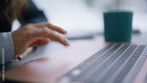 Finger touching laptop surfing internet workplace closeup. Businesswoman working