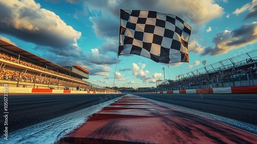 Finish racing flag with fast effect. A racing flag is flying in the air above a race track.