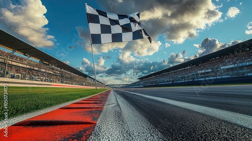 Finish racing flag with fast effect. A racing flag is flying in the air above a race track.
