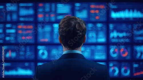 Fintech Concepts, A person in a suit observes a wall of digital data displays and graphs.