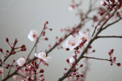 Fioritura di delicati fiori di Prunus appena sbocciati su fondo bianco