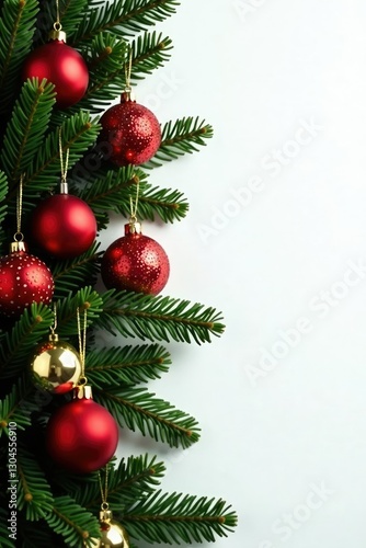 fir branch decorated with red gold ornaments against white backdrop, Xmas season, Xmas decoration
