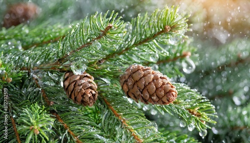 fir branches with snowflakes and pine cones close up