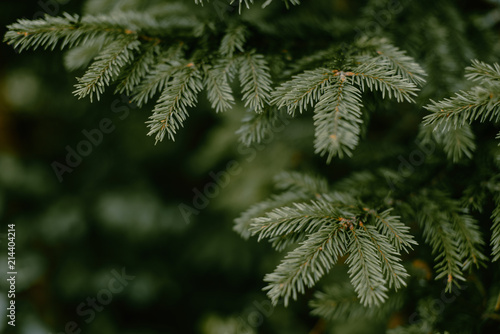 Fir tree brunch close up. Shallow focus. Fluffy fir tree brunch close up. Christmas wallpaper concept. Copy space.