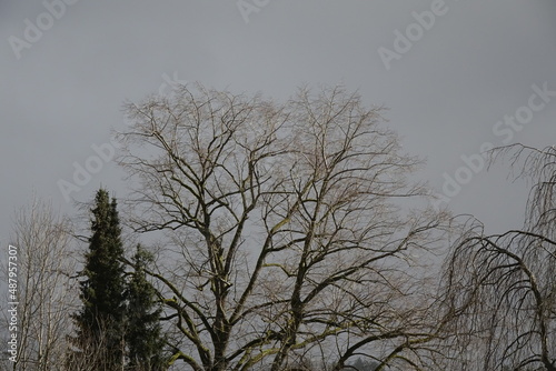 Fir trees and empty foliage tree on a stormy winter day in Siegerland (horizontal), Dahlbruch, NRW, Germany