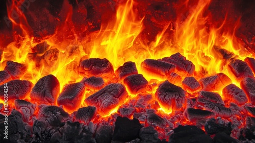 Fire embers glowing brightly in a barbecue grill, charcoal heat for grilling and cooking food outdoors, vibrant flames and hot coals background.