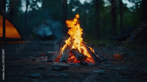 Fire flames rising and moving at dark night in dark blurred background. Camping fire suitable backdrop