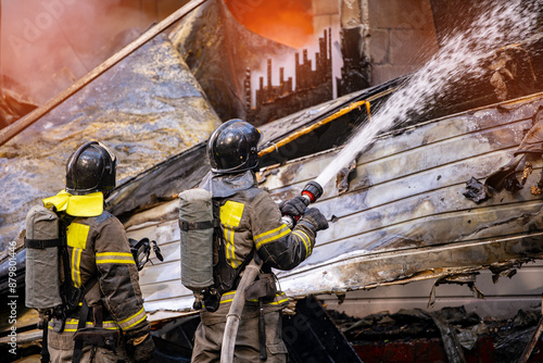 Fire incident in building. Action photo fireman team extinguishes burn with hose water