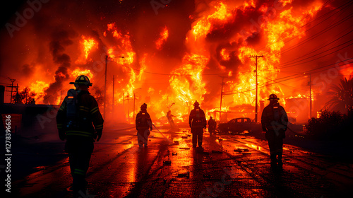 firefighter, fire, building, blaze, urban, emergency, flames, inferno, dramatic, rescue, night, heroism, danger, crisis, safety, response, towering, destruction, smoke, heat, engulfed, hazardous, glowing, structure, city landscape, silhouette, adrenalin, scene, bravery, chaos, intensity, professional, alertness, urgency, catastrophy, blazing, teamwork, dedication, operation, night time, skyline, effort, glow, resilience, risk
