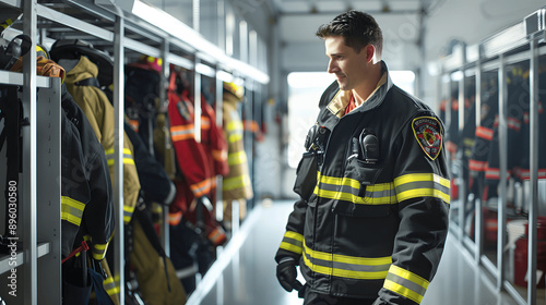 firefighter, bright, fire, station, preparing, equipment, gear, organised, clean, environment, professional, job, working, detail, safety, firefighting, rescue, fireman, tool, preparation, organisation, workplace, emergency