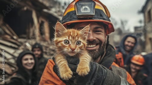 earthquake, rescue, firefighter, kitten, cat, disaster, building, destroyed, debris, debris, emergency, help, saving, hope, survival, natural disaster, destruction, damage, ruin, aftermath, crisis, emergency services, helmet, uniform, safety, protection, pet, cute, adorable, orange, ginger, felino, caring, compassion, empathy, hero, bravery, courage, community, support, volunteer, devastation, loss, rebuilding, recovery