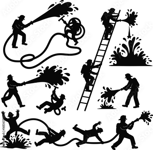 firefighter, fire, hose, ladder, rescue, water, spray, emergency, safety, silhouette, fireman, action, teamwork, vector, climb, fire hose, water spray