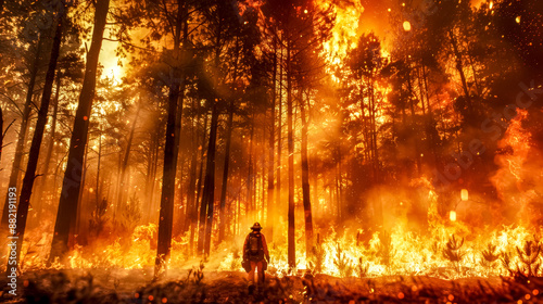Firefighter walking through burning forest during wildfire