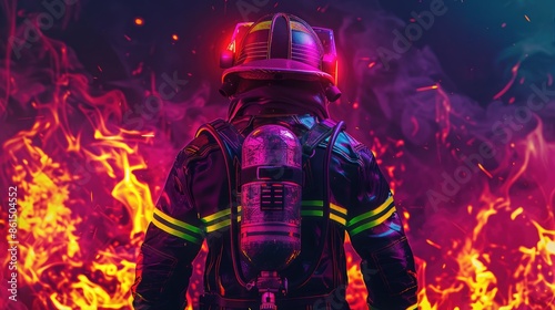Fireman amidst digital flames, back view, cyberpunk, dark neon colors, mixed media, virtual blaze