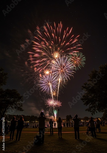 fireworks, exploding, display, night, sky, dark, celebration, event, crowd, watching, silhouette, tree, grass, field, people, person, gathering, light, bright, show, festival, fourth, july, holiday, america, new year, party, fun, recreation, evening, park, performance, summer, weekend, vacation, pyrotechnic, entertainment, landscape