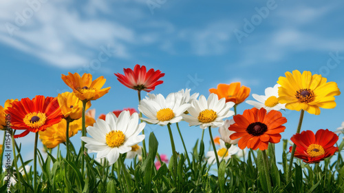 First Day of Spring concept. Vibrant meadow filled with blooming wildflowers under blue sky