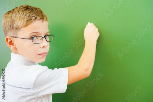First grade schoolboy wrote on blackboard with chalk at classroom