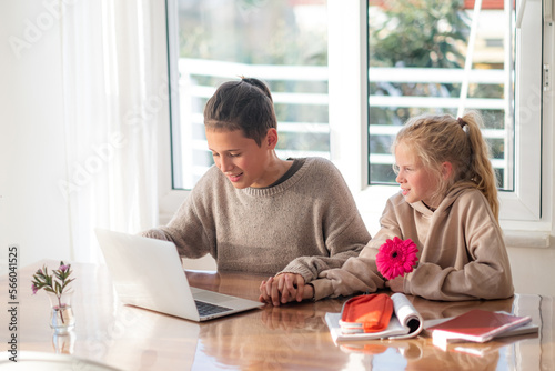 First love, young teens lovers couple studying laptop at home, holds hands, boy and girl doing homework, first dating, flower and kids love.