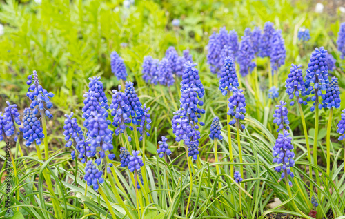 First spring flowers blue muscari in the garden. Grape hyacinth or bluebells