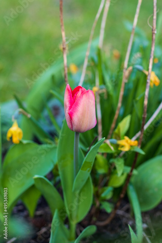 First tulips growing in the garden, early spring flowers with fresh and intese colors
