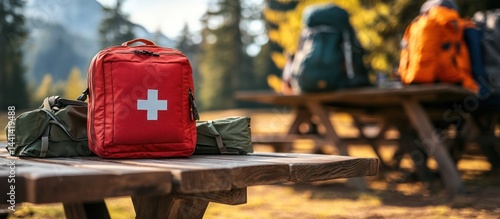 first aid, kit, backpack, picnic, table, forest, wilderness, camping, hiking, nature, mountain, travel, emergency, survival, preparedness, medicals, safety, supply, gear, timberland, autumn, scenic, tranquil, outdoors, tour tourism, adventure, healthy, precaution, care, peace, quiet, calm