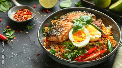 fish, and, boiled, egg, combined, fried, berry, flavoured, rice, background, food, lemon, cooking, breakfast, asian, siam, tomatoes, healthy, chinese, plate, vegetable, seafood, carrot, dinner, meal, cookery, lunch, dish