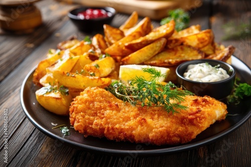 Fish and chips with breaded fish and fried wedges on a dark wooden surface