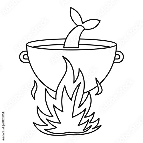 pot, campfire, outline, icon, vector, thin, line, black, object, fish, food, hot, cooking, balefire, fire, firewood, flames, cook, camp, kettle, dinner, soup, wood, heat, pan, tour tourism, smoke, nature, picnic, kitchen, iron, boil, metal, traditional, travel, burn, holiday maker, cauldron, prepare, coal, fireplace, old, adventure, trip, water, forest, stew, blaze, utensil