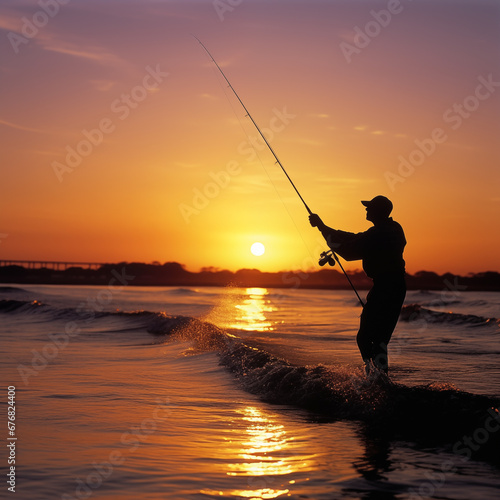 man, enjoying, fishing, hobby, standing, spinning, rod, river, bank, sunrise, morning, generative, ai, fisherman, lake, fish, water, nature, male, sport, angler, leisure, reel, summer, person, activity, shore, recreation, action, catching, duck pond, coastline, active, lifestyle, accessory, lakeshore, river bank, riverside, rural, scene, tranquil, wilderness, area, sportfishing
