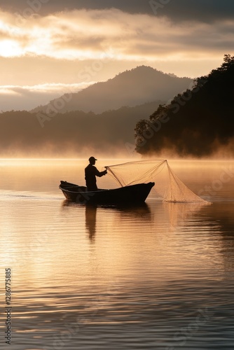 seafood, fisherman, dawn, harvest, calmness, net, serene, ripple, visual, skill, harmony, exploration, peaceful, wave, perspective, sunshine, community, tradition, marin, hobby, land, recreation, sunrise, horizon, silhouette, vessel, wildlife, action, photo, calm, scenery, sunlight, capture, stillness, daybreak, life, meditative, rural, scenic, local, small, lifestyle, outdoors, season