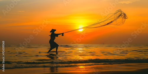 Fisherman throwing fishing nets to the sea for his last try before the sunset, sunset fishing, fishing nets, sea fishing, last fishing attempt