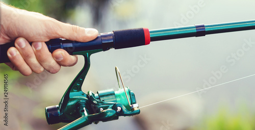 fisherman, fishing, man, people, hobby, rod, spinning, nature, fish, male, guy, person, human, sport, leisure, health, active, lake, river, forest, summer, autumn, sunset, sunlight, reel, rural, concept, get-away, countryside, hand, holding, background, evening, catch, casting, angle, morning, dawn, close, up, closeup, object, still life, twisting, line, arm