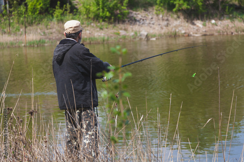 fisherman, beard, catches, fish, fishing, shore, fishing pole, spinning, reel, handle, line, water, rest, active, river, lake, duck pond, reed, hobby, season, autumn, summer, spring, vacation, holiday, pleasure, nature, beautiful, stand, predator, pike, perch, device, tackle, catch, telescopic, cap, butt, jacket